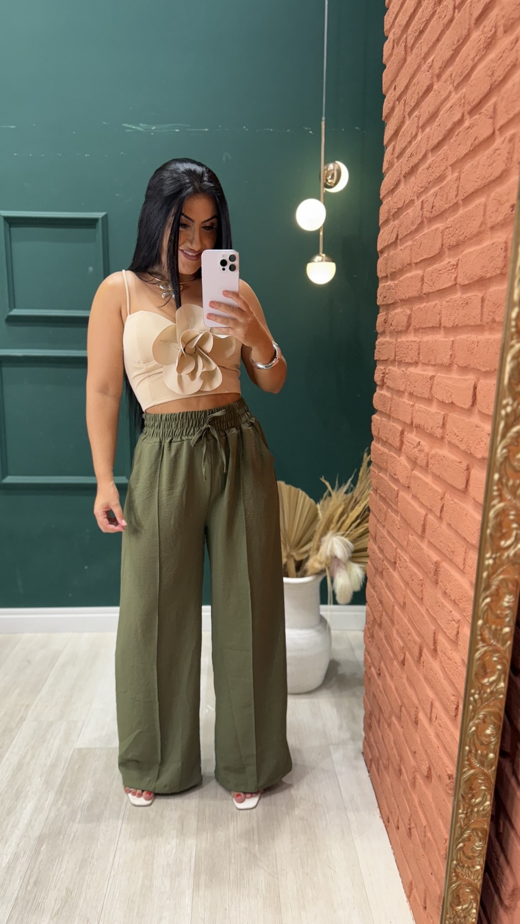 CALÇA PANTALONA BELA , ELASTICO NA CINTURA , BOLSOS NAS LATERAIS,DETALHES DE COSTURA NA FRENTE DA PEÇA.